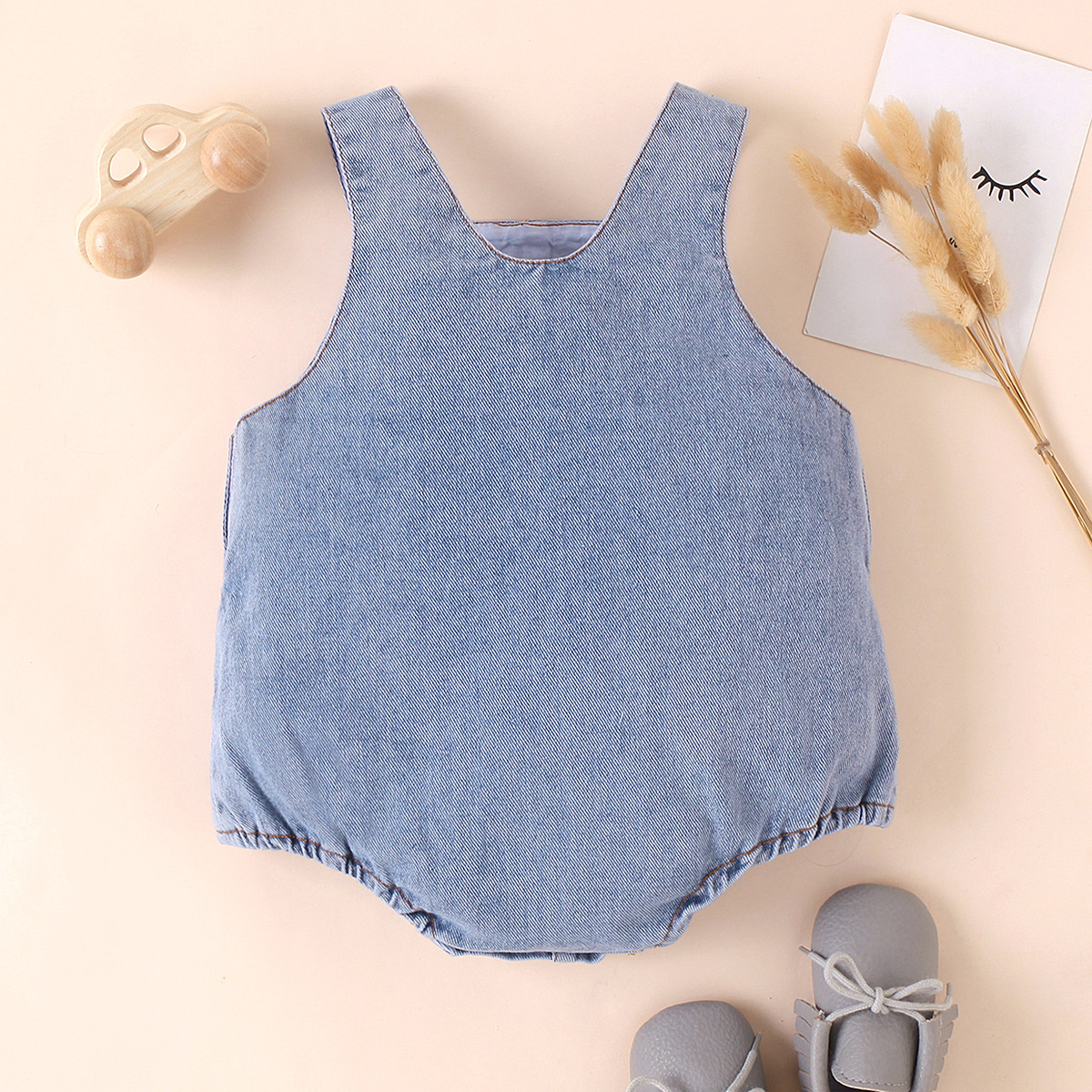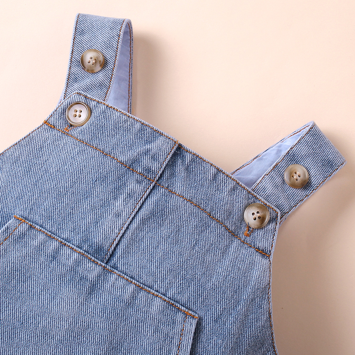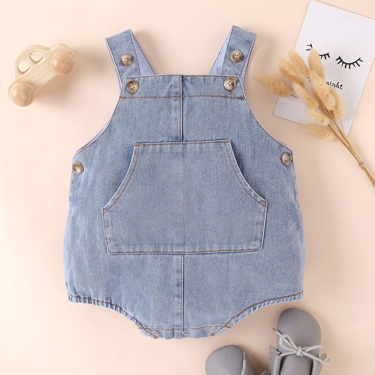 Children’s clothing baby onesie, buttons, open pockets, denim overalls, and baby crawling clothes